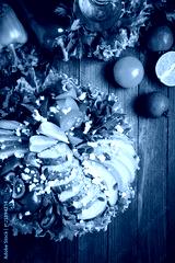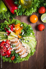Healthy salad plate with colorful tomatoes, chicken, cheese, avocado, lime and mixed greens on wooden background top view. Food and health. Nutritious meal.