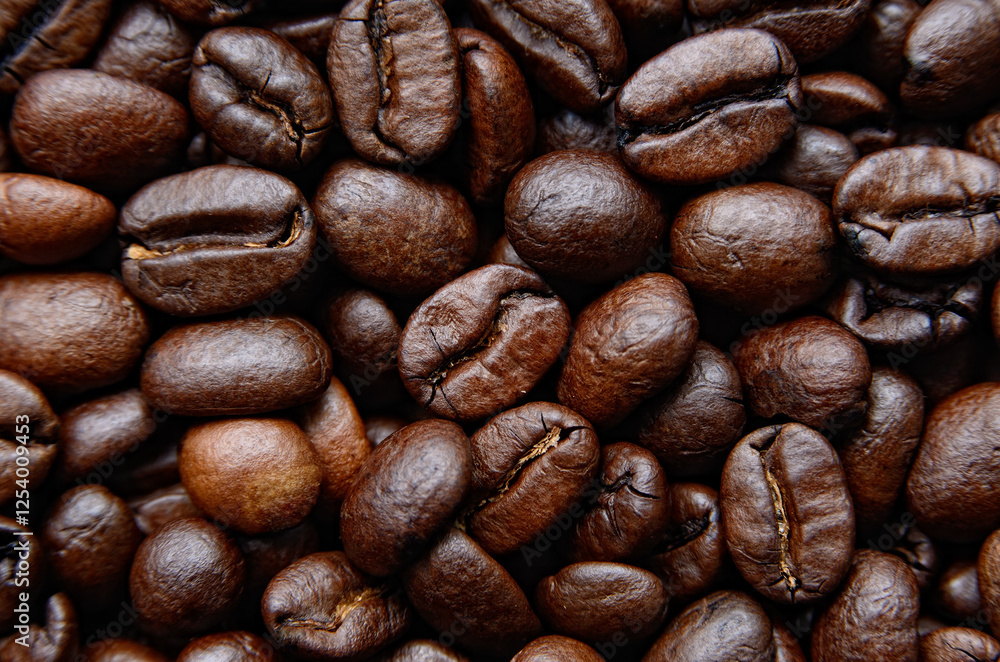 Roasted coffee beans background, close-up view