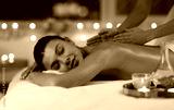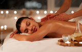 Peaceful European woman having back massage at oriental spa, room decorated with candles and aromatherapy tools for calm atmosphere
