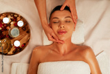 Top view of beautiful lady enjoying head massage session with aromatherapy at Thai spa, lying by aroma plate