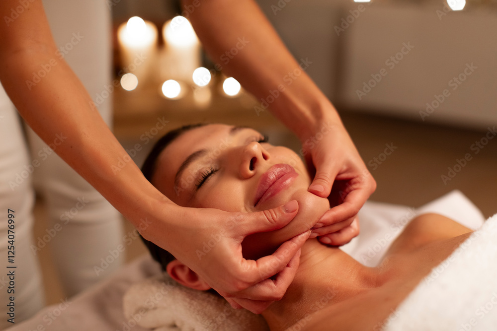 Relaxed lady getting healing and face lifting massage at modern luxury spa in romantic atmosphere, masseur rubbing woman's chin, closeup