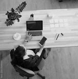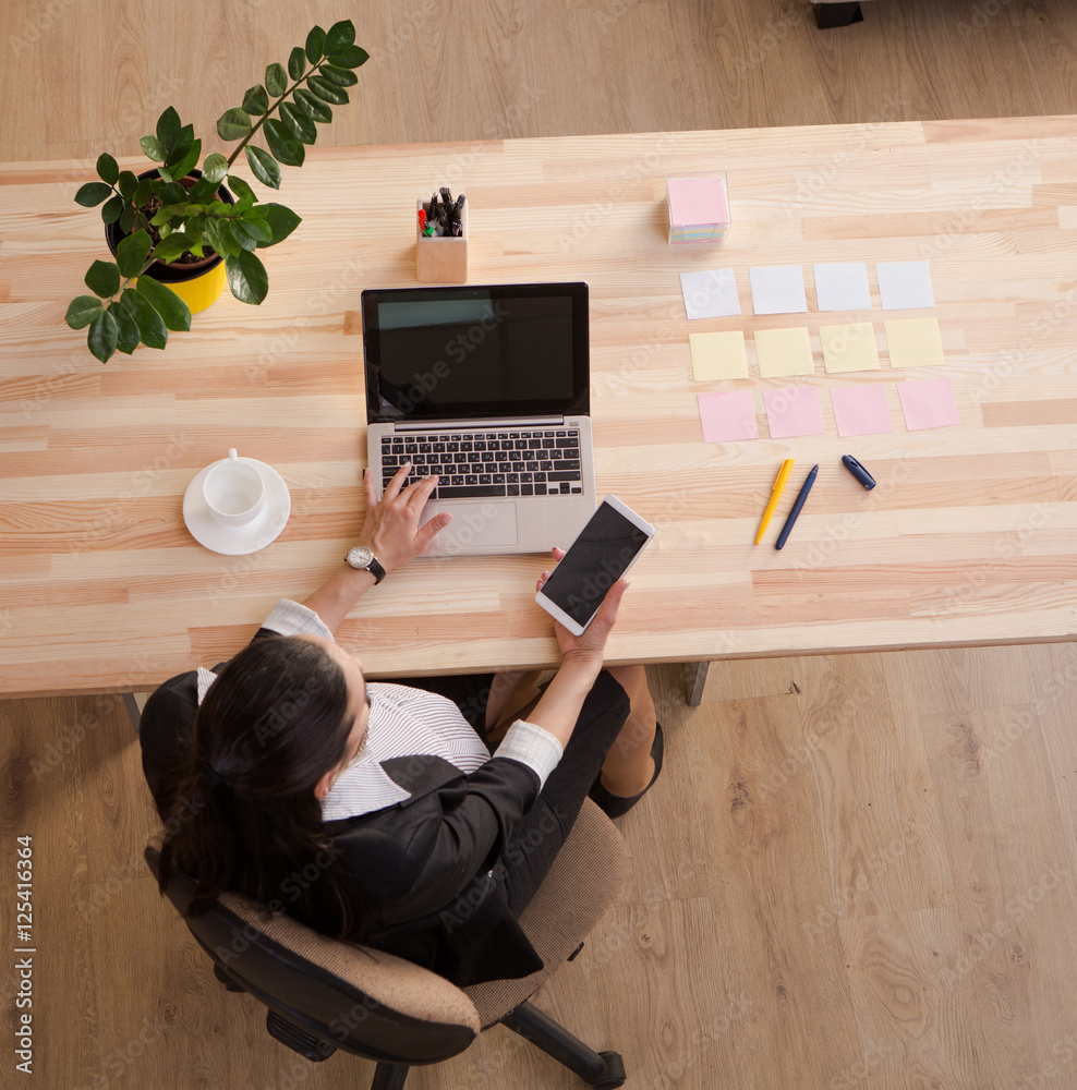 Top view of pregnant business woman sitting at table in front of laptop computer and holding mobile or smart phone. All screens are blank for your ideas, desires or memories.