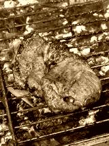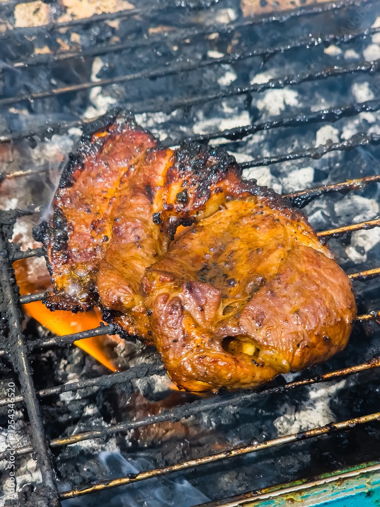 Lamb meat with grill marks on a barbecue grill ready to be eaten with fire and smoke coming out of the grill.