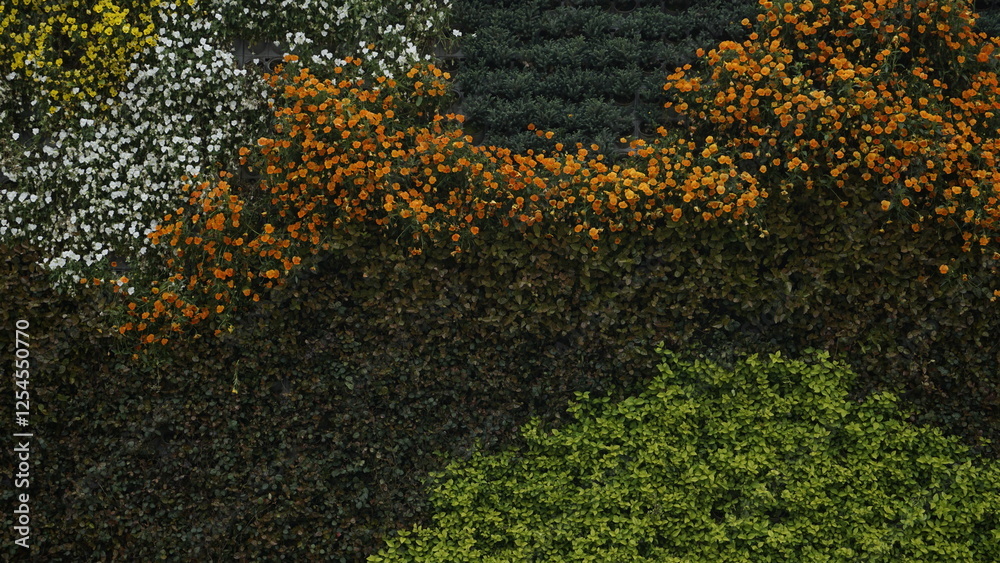Lush Vertical Garden with Vibrant Flowers and Greenery