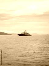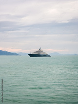 Cruise ship near the coast. Blue sea and the blue sky. Summer seascape. Travel and vacation concept.
