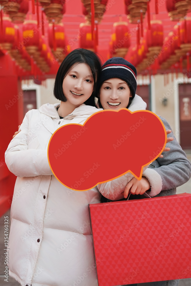 Celebrating Together: Joyful Women Shopping in a Vibrant Red Lantern Festival