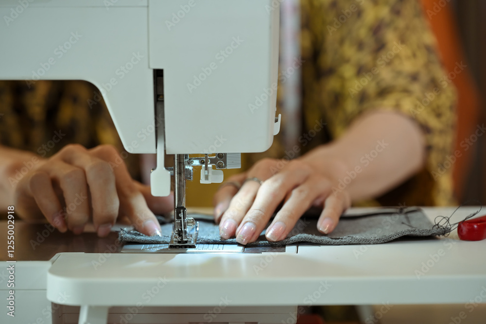 Close up of fashion designer or tailor hands sewing fabric on a sewing machine