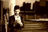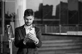 Professional businessman in a suit checking smartphone outside a contemporary office building