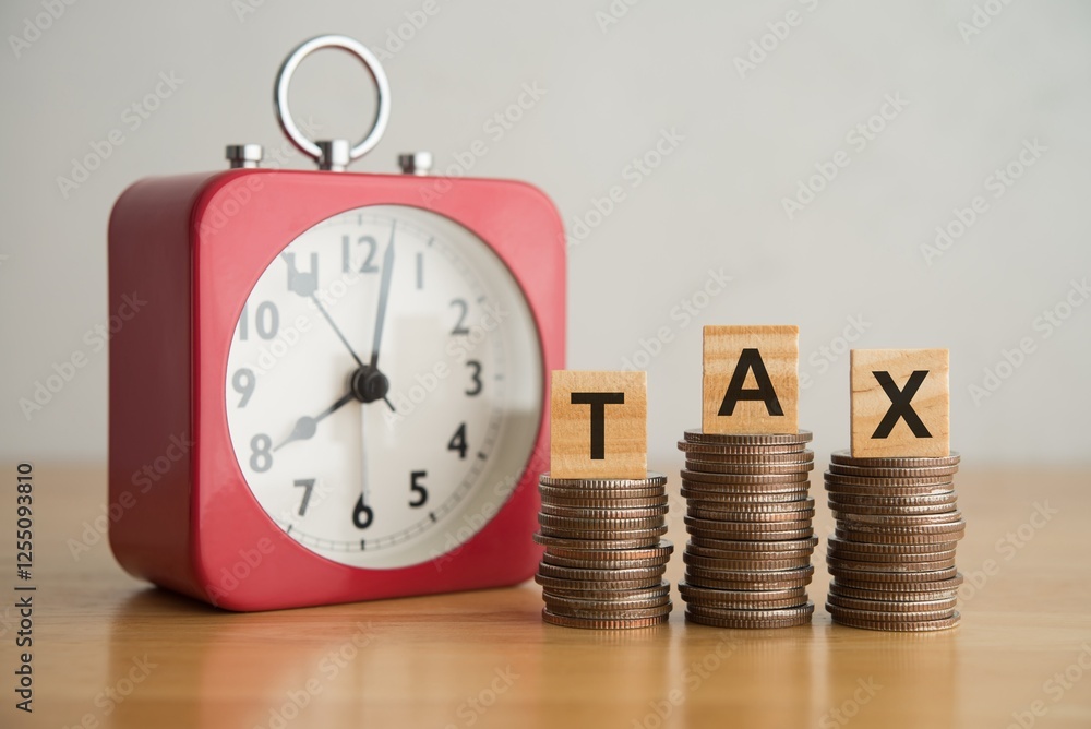 Red alarm clock and TAX alphabet on stack coins with white wall background. Tax payment reminder, taxation, financial planning and management concept.
