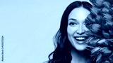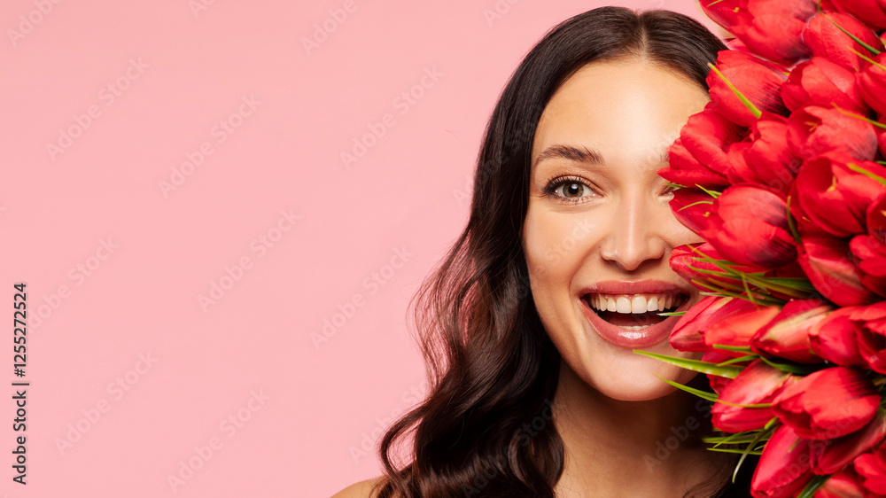 Excited beautiful young woman posing with bouquet of red tulips near face, standing isolated on pink background and smiling at camera, closeup