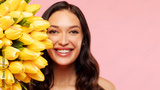 Happy young European lady with bouquet of beautiful yellow tulips posing on pink background, International Women's Day and spring holiday
