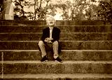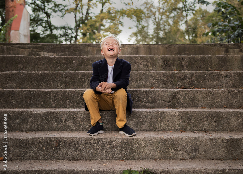 Chłopiec śmieje się na schodach. Mały chłopiec siedzi rozbawiony na schodach.