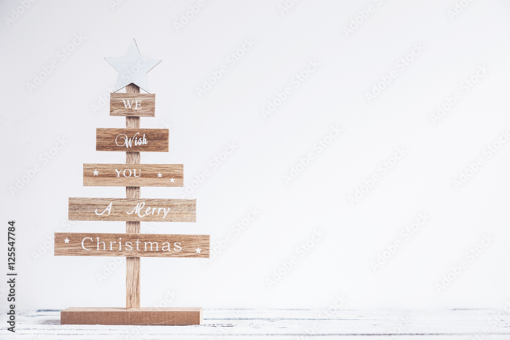 Wooden rustic christmas tree decoration on white background. Christmas inspiration.