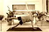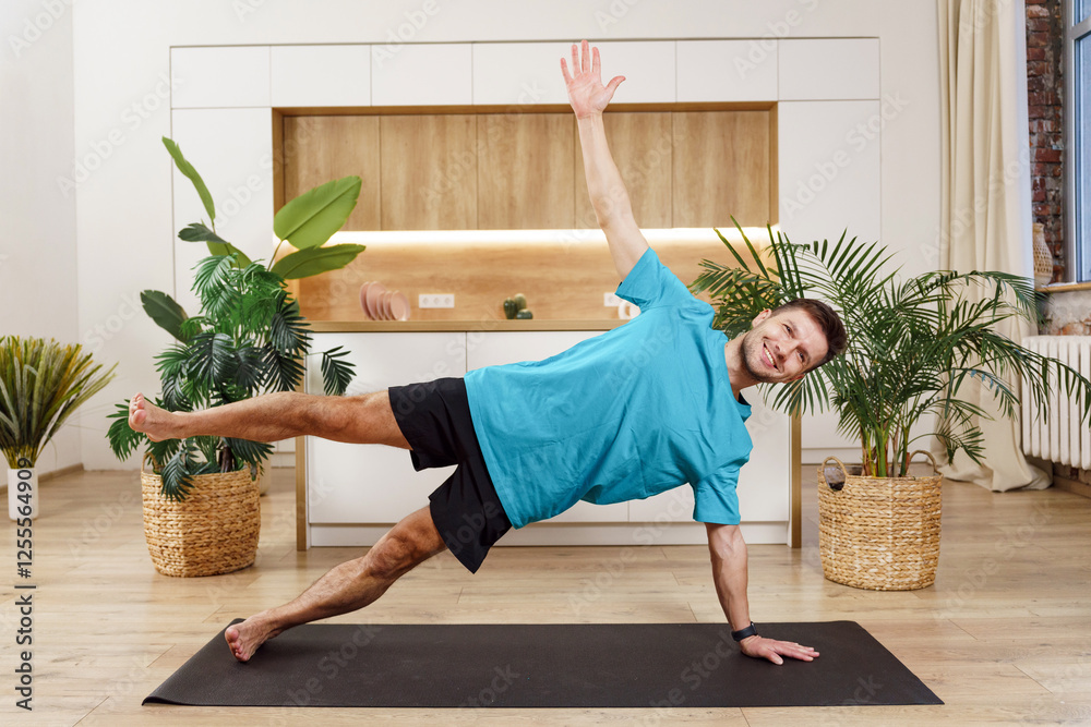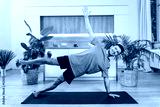 Active individual performing a side plank exercise in a bright indoor space surrounded by plants