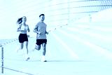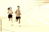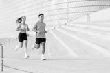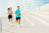 Couple runs together on outdoor steps in a modern urban setting during the morning