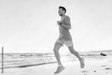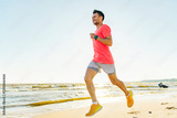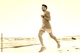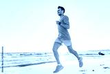 Man jogs along the beach during sunrise near a coastal area with gentle waves and a clear sky