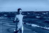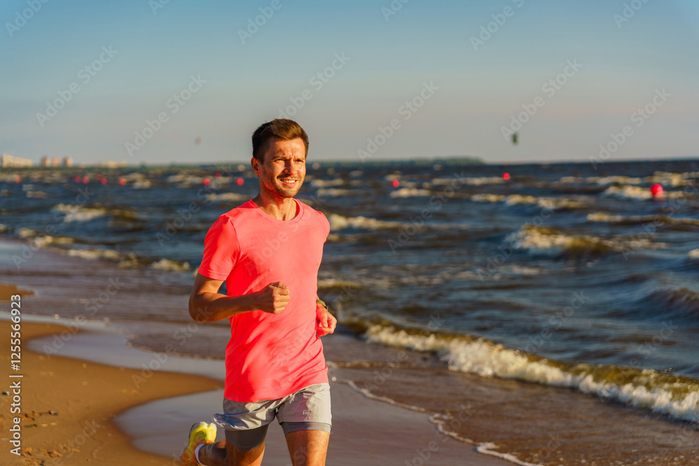 Man jogging along a sandy beach near the ocean in warm weather during late afternoon hours