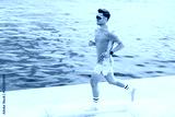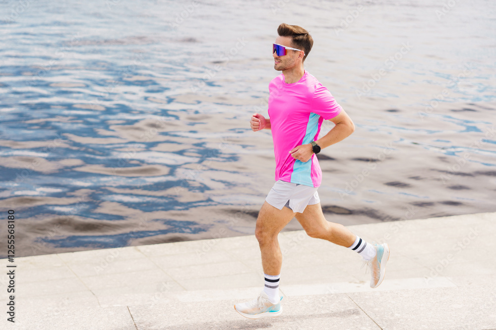 Man jogging along a waterfront path in vibrant athletic wear during daylight hours