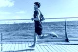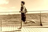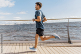 Dynamic running along the waterfront pathway on a sunny day near the water's edge