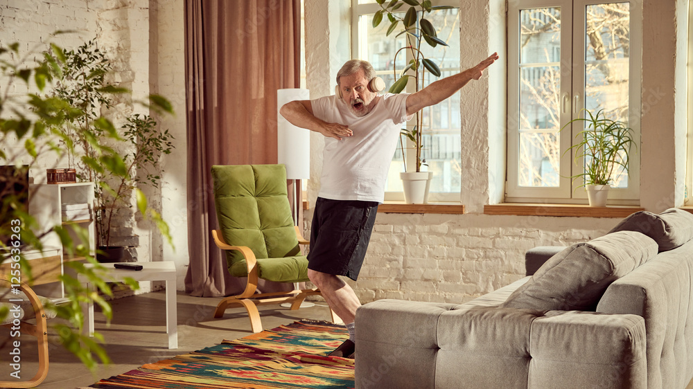 Elderly man in home wear listening to music in headphones and dancing in modern living room at home with potted plants and grey couch. Concept of happiness, elderly lifestyle, relaxation