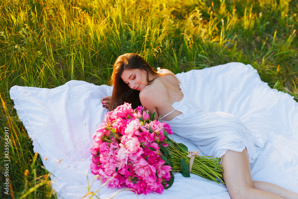 Young woman in a white dress lying on a blanket in a sunny meadow with a large bouquet of vibrant pink peonies, enjoying a peaceful summer afternoon.