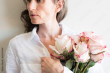 Middle aged woman in white shirt holding bouquet of pink and cream roses (cropped and selective focus)