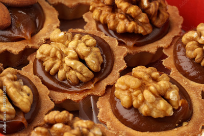 Delicious walnut pastries topped with rich chocolate filling and perfectly toasted nuts