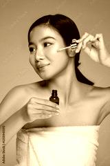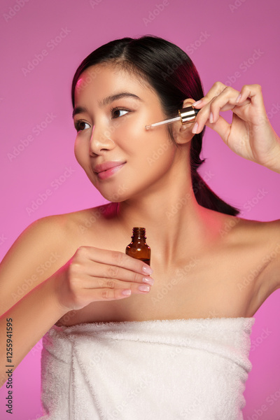 Woman applies serum to her face while smiling against a bright pink background in a beauty routine