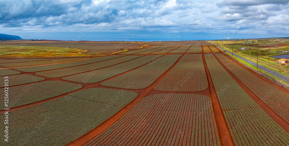 Aerial perspective of Oahu's Dole pineapple plantation with red soil fields, geometric patterns, a road, scattered buildings, and a cloudy ocean horizon.