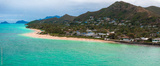 Aerial view of Lanikai Beach on Oahu Island, Hawaii, featuring turquoise waters, sandy shoreline, lush green hills, and coastal homes along the coast.