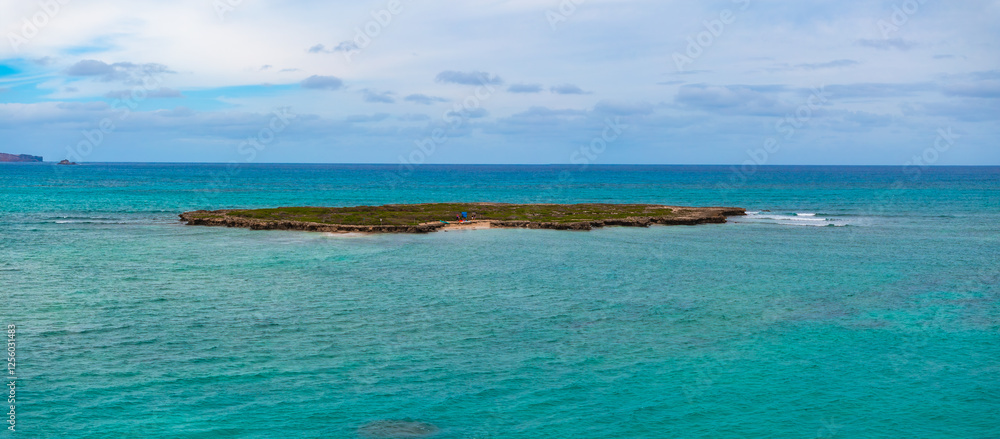 A flat island with low vegetation and a sandy area surrounded by calm turquoise waters. People are visible, with blue skies and scattered clouds above.
