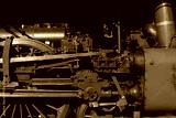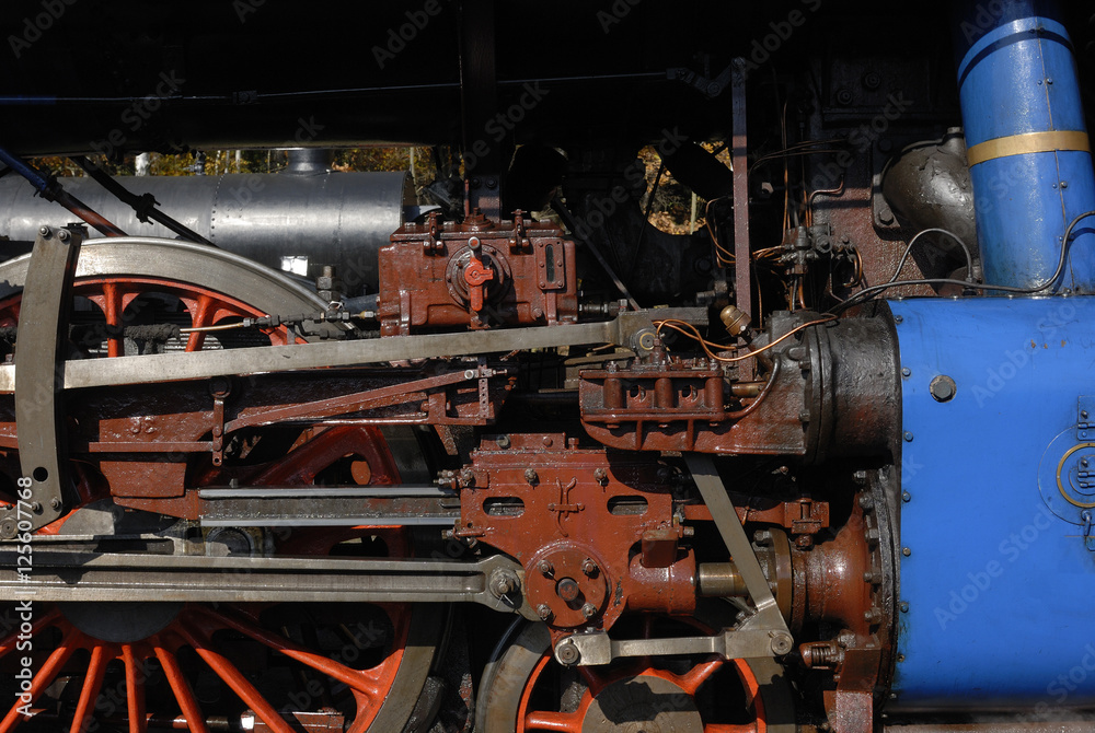 Steam locomotive wheels and rods closeup. Detail of mechanical parts, wheels and equipment of the train.