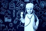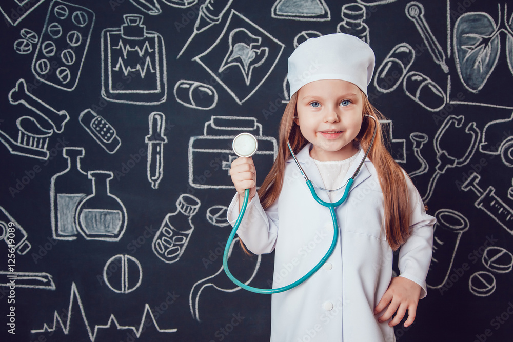 Little girl in doctor costume holding sthetoscope on dark background with pattern