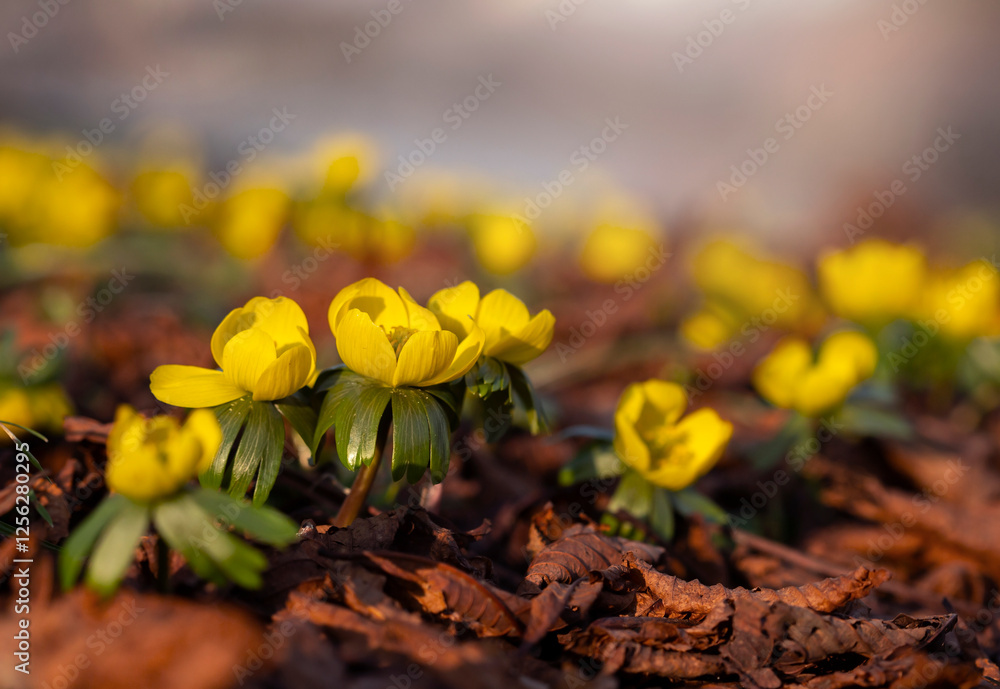 Wiosenne kwiaty . Kwitnące Ranniki w parku.
