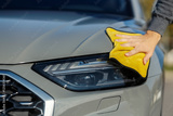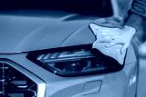Close up of a male's hand cleaning car headlights at self service car wash.