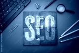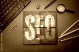 SEO Concept. Wooden puzzle pieces with text on a dark office table