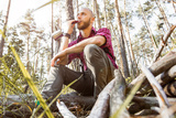 Tourist at rest plays the harmonica and looks into the distance