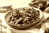 Braised chicken gizzards with onion, carrot, celery, tomato. in a rustic terracot plate.