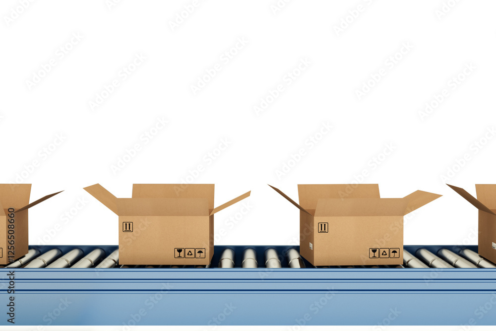 Cardboard boxes moving on conveyor belt in distribution warehouse