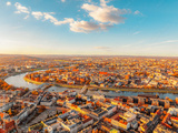 Church Saint Joseph at Podgorski Square in Podgorze district city view near river in Krakow Poland. Autumn landscape on coast river Wisla.