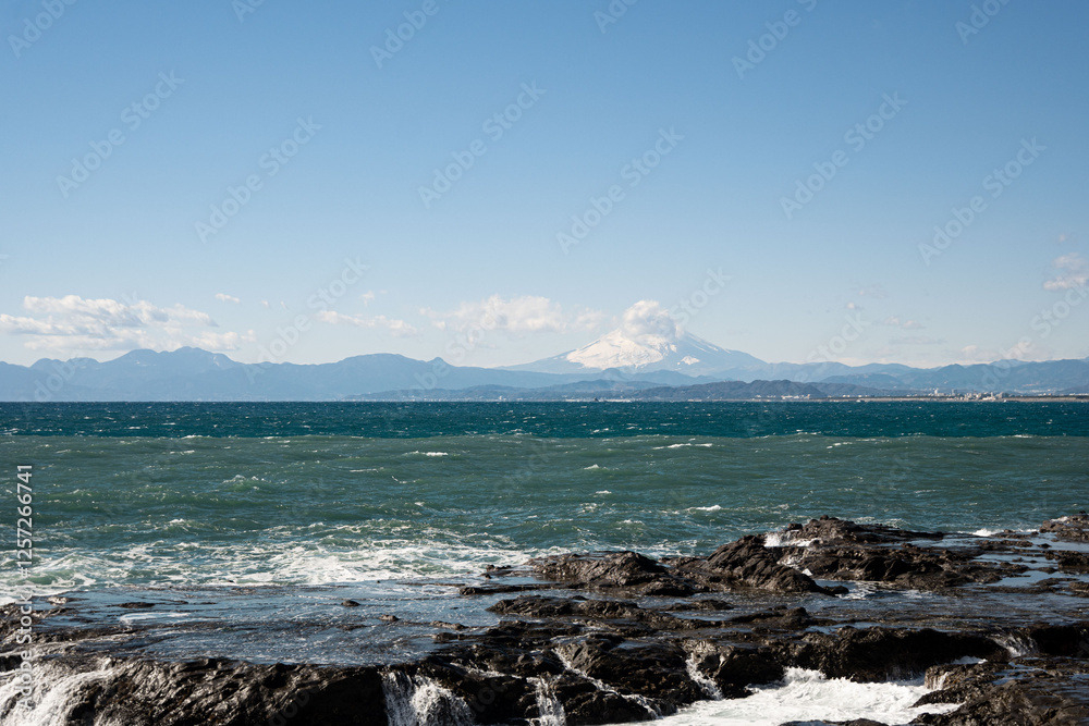 Mount Fuji, wide panoramic view over the waters of the Sagami Bay on Mount Fuji in the distance with blue sky and space for text from Enoshima Island at daytime in winter in Japan.