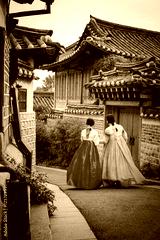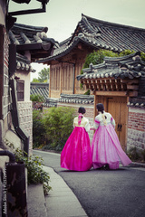 A couple women wander through the traditional style houses of Bukchon Hanok Village in Seoul, South Korea.