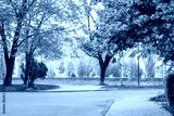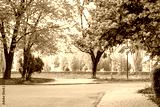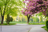 cherry blossom on the city street. branch with pink flowers. old european town on a sunny morning. masaryk park in uzhhorod. popular travel destination