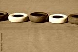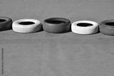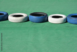 Five colorful tires, two white and three blue, stand in a row on a vibrant green surface