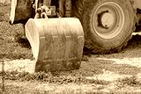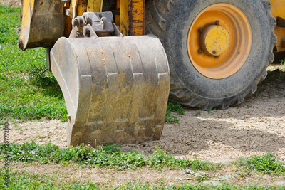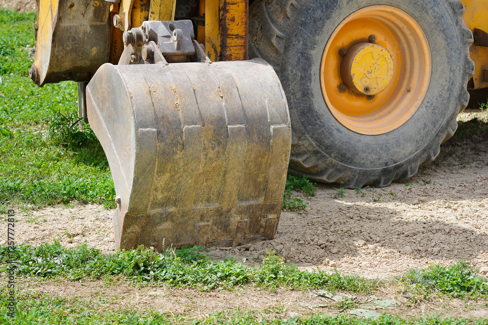 A rusty, weathered bulldozer bucket rests on a patch of dirt and sparse grass