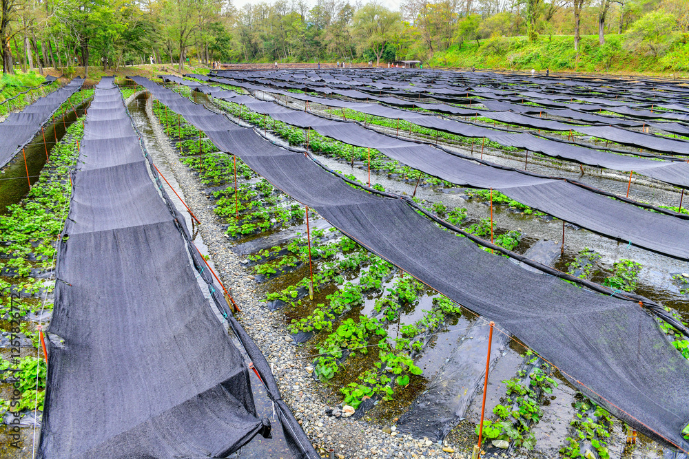Green Wasabi plant in field with protective shade along river stream in Japan