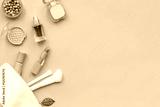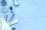 Makeup accessories - brushes and pink pastel cosmetic products, flat lay, top view