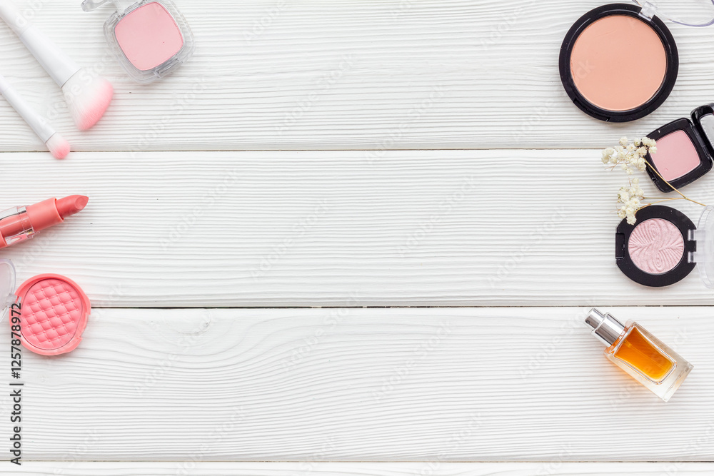 Makeup accessories - brushes and pink pastel cosmetic products, flat lay, top view