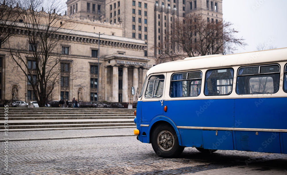 Historical Touristic Bus Over Warsaw Building Of Science And Culture