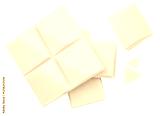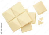Isolated White Chocolate bar Explosion. Levitating milk chocolate pieces shattering on white background. Falling Chocolate chunks. Package design element